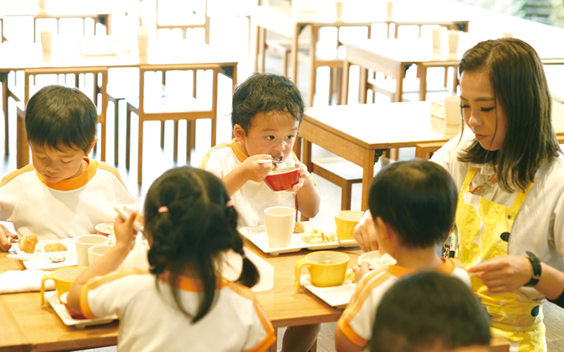 奥にガラス張りの給食室があり、園庭にも面した開放的な気持ちのよい空間で昼食。必要に応じて保育教諭が補助し、行儀よくおいしそうに食べる子どもたち。