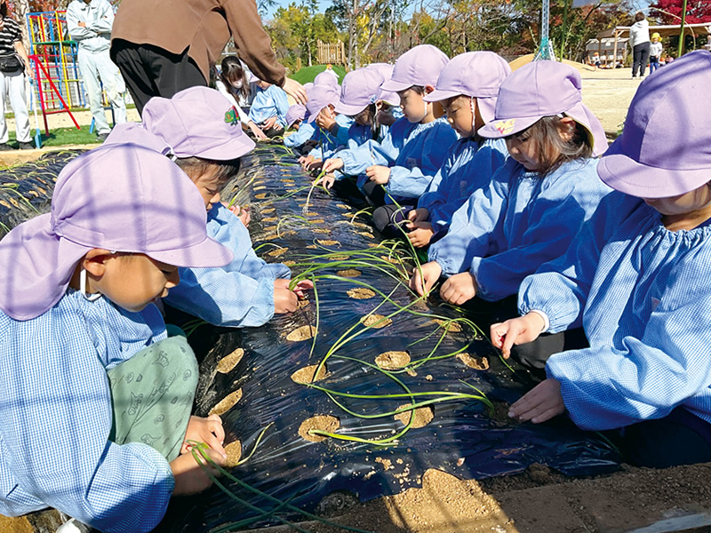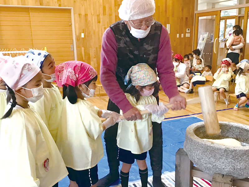アタラシイカタチのこども園では、玉ねぎや大根、きゅうり、とうもろこしなどを種または苗から栽培し、子どもたちが日常的に水やりや観察を続け、野菜への関心や愛着を深めています。収穫した野菜は家庭に持ち帰ってもらうほか、調理や販売体験にも発展させ、苦手な食べ物を克服する子も。毎年12月には地域の高齢者に教えてもらいながら餅つきを体験するなど、日本の伝統的な食文化にふれる機会も設けています。