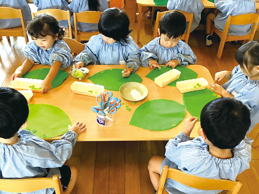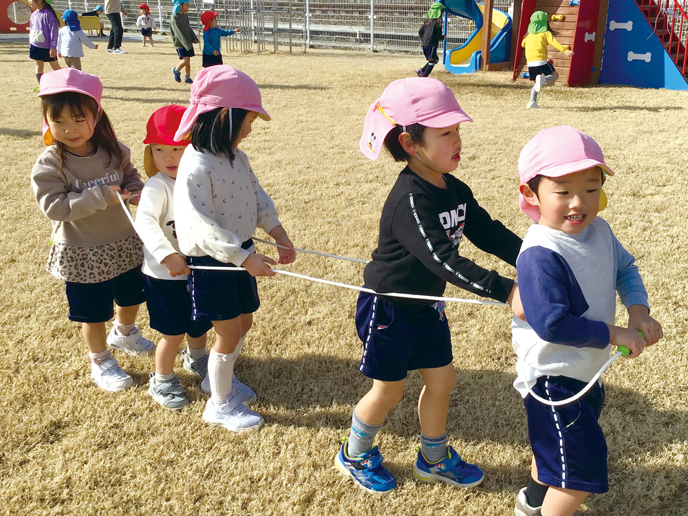 英語教室ではアクティブラーニングを主体とし、3~5歳児がゲームやカード、絵本、おもちゃなどを使ったり、体を動かしながら自然に英語にふれ、英語を使った表現にチャレンジしています。また外国人講師がふだんの保育時間も英語でコミュニケーションを取り、子ども達が語学への興味をより高め、英語で交流する喜びをより身近に感じてもらえます。園で共有できるよう、保育教諭もレッスンに参加しています。保護者からは「家でも英語で返事をしていて驚いた」などの声があがっています。